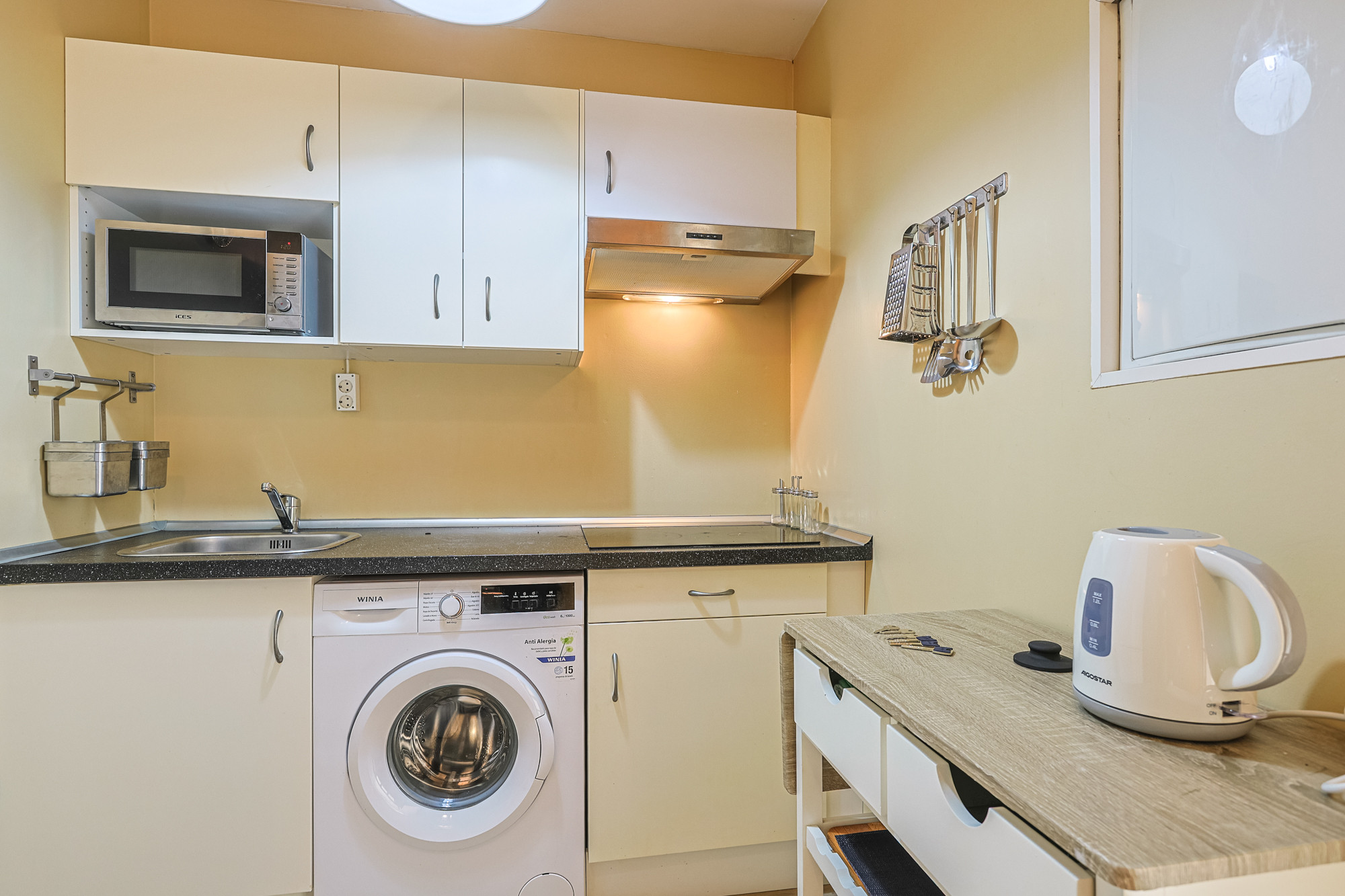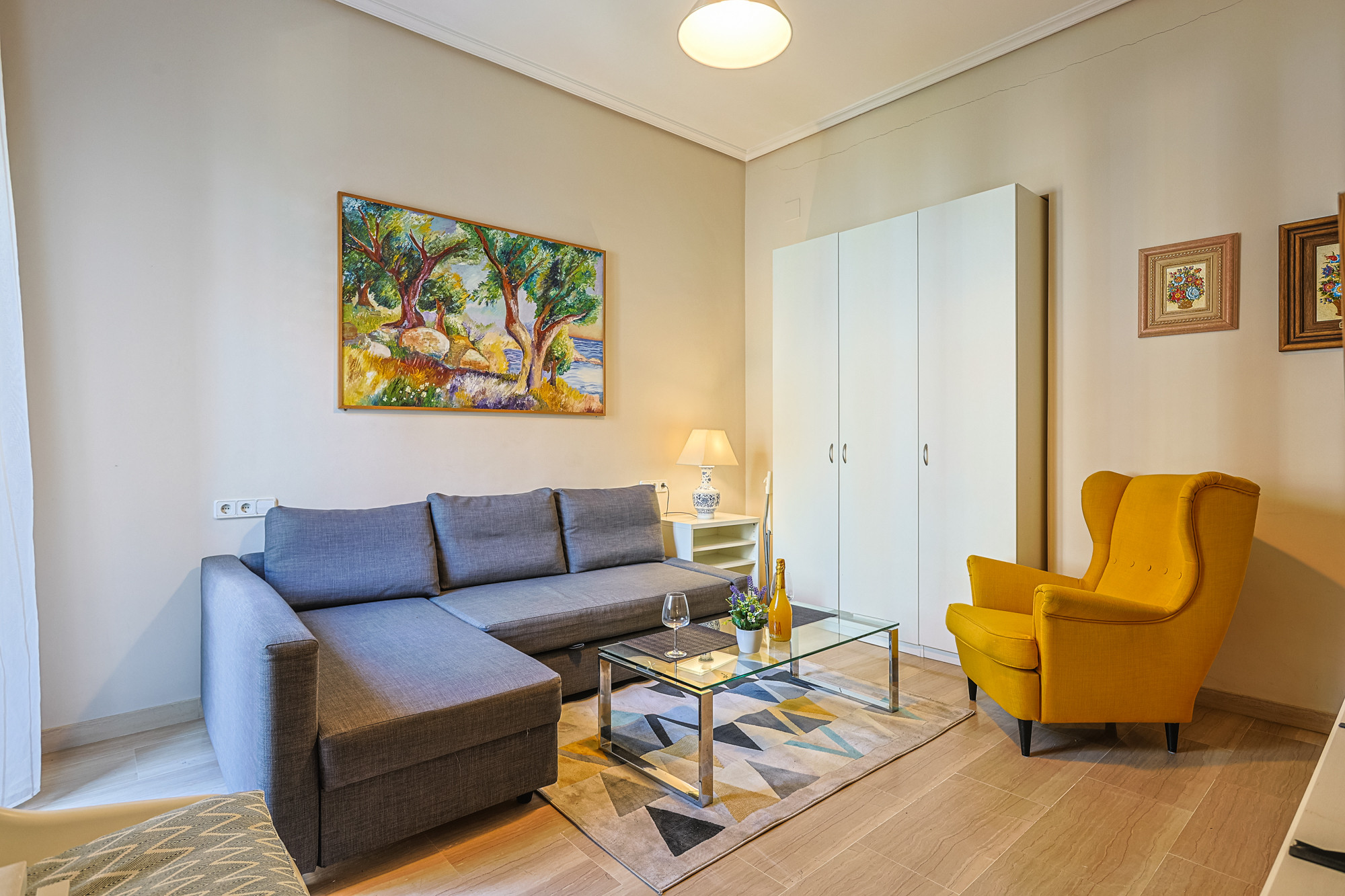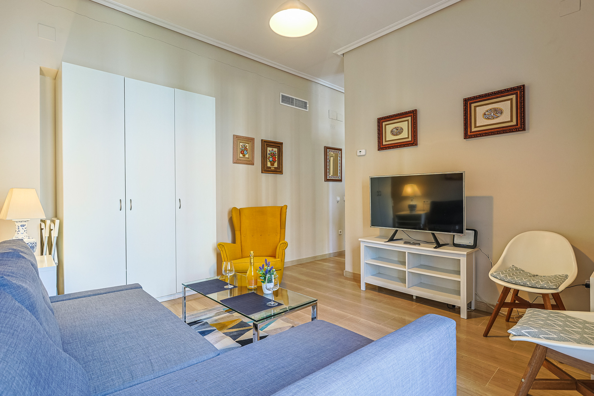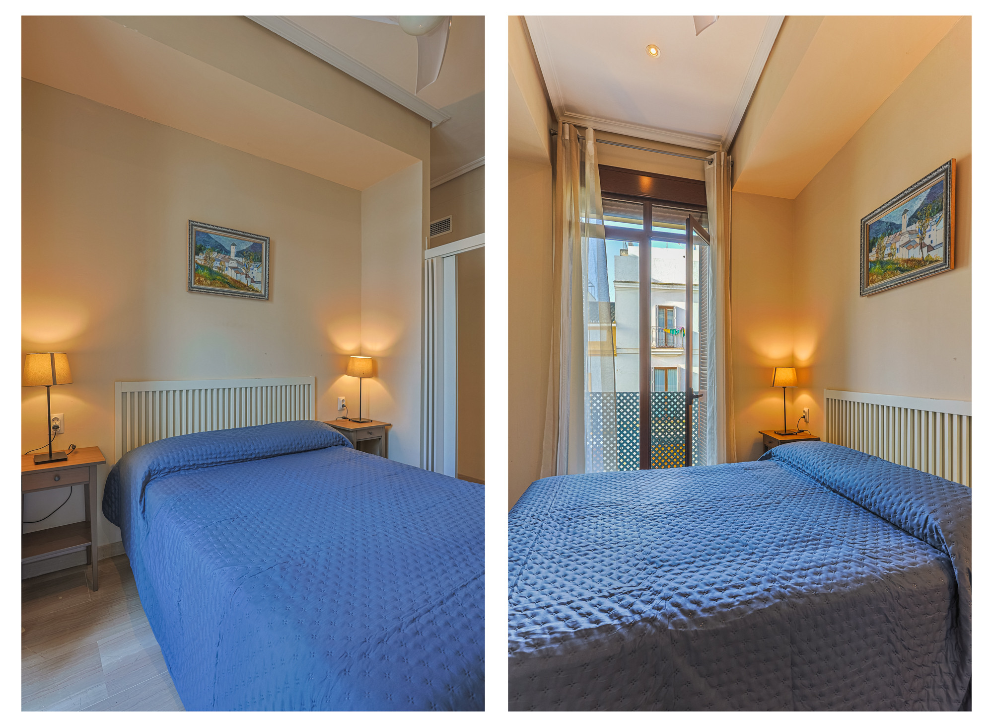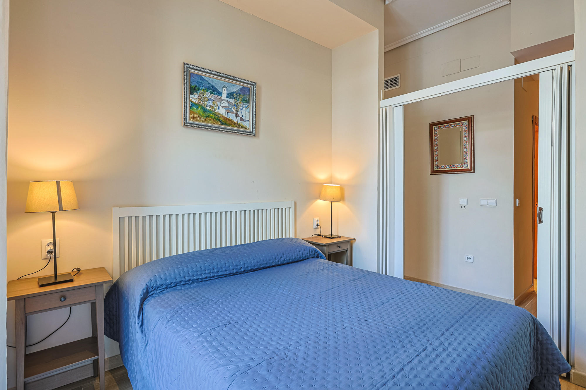El apartamento cuenta con un dormitorio con cama doble, equipado con aire acondicionado frío/calor y ventilador de techo para garantizar tu confort en cualquier época del año. En el salón encontrarás un cómodo sofá cama, ideal para completar la capacidad si viajas en familia o con amigos.